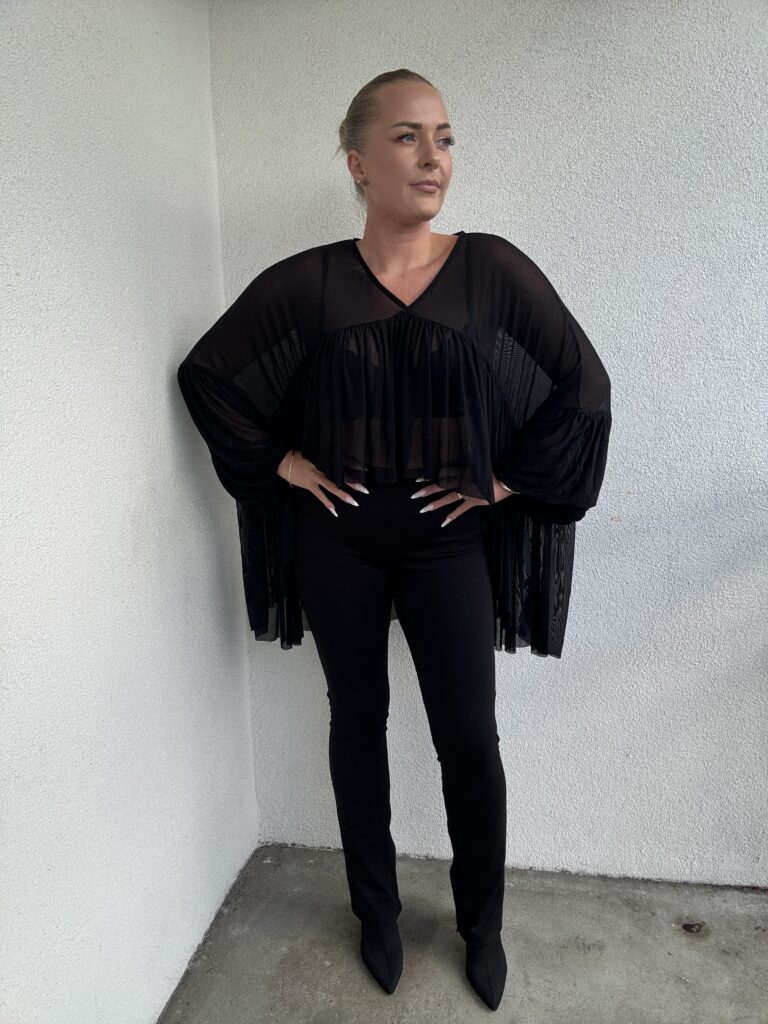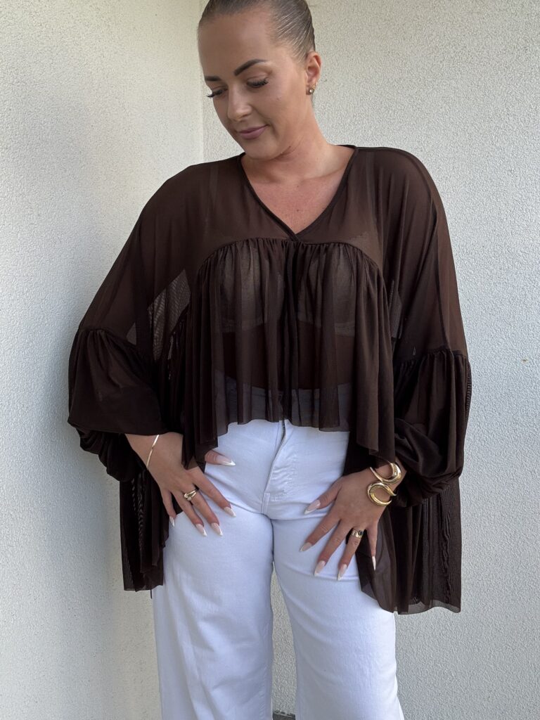 Bluzka FLY w kolorze gorzkiej czekolady (dostępna również czarna). Jej asymetryczny, przedłużany z tyłu fason idealnie sprawdzi się do każdej figury. Falbanki oraz siateczkowy materiał dodaje jej lekkości.