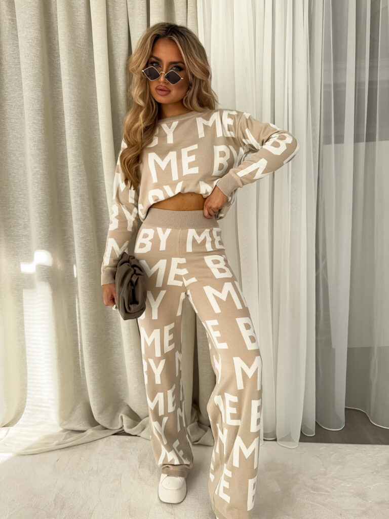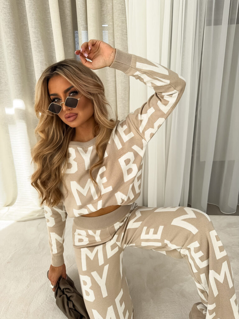 Komplet sweterkowy, składający się ze sweterka na długi rękaw oraz spodni o luźnym kroju z gumką, jest idealnym wyborem na casualowy, ale stylowy look.