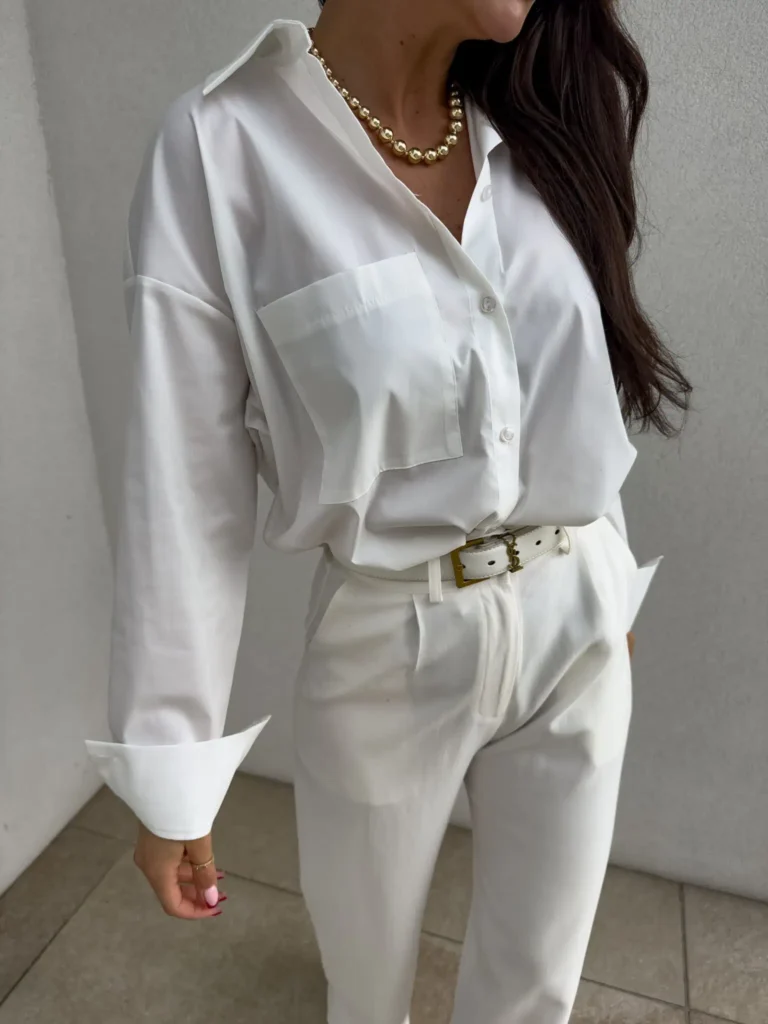 Koszula CLASSY WHITE to basicowy model. Rękawy z dużymi mankietami oraz piękny kołnierz. Ma kieszeń po prawej stronie. Klasyka, styl i nowoczesność. Fason oversize.