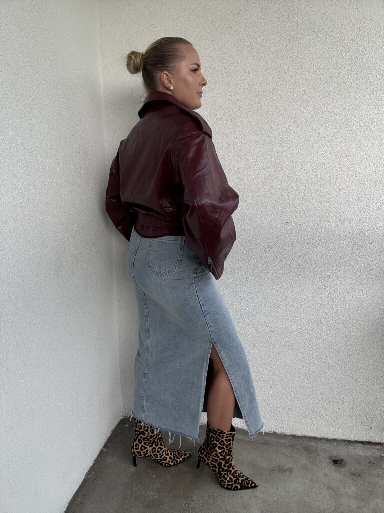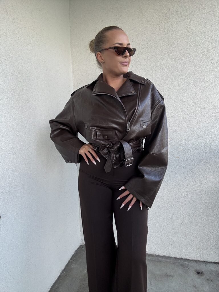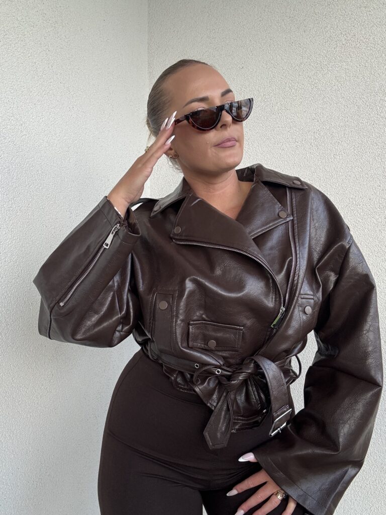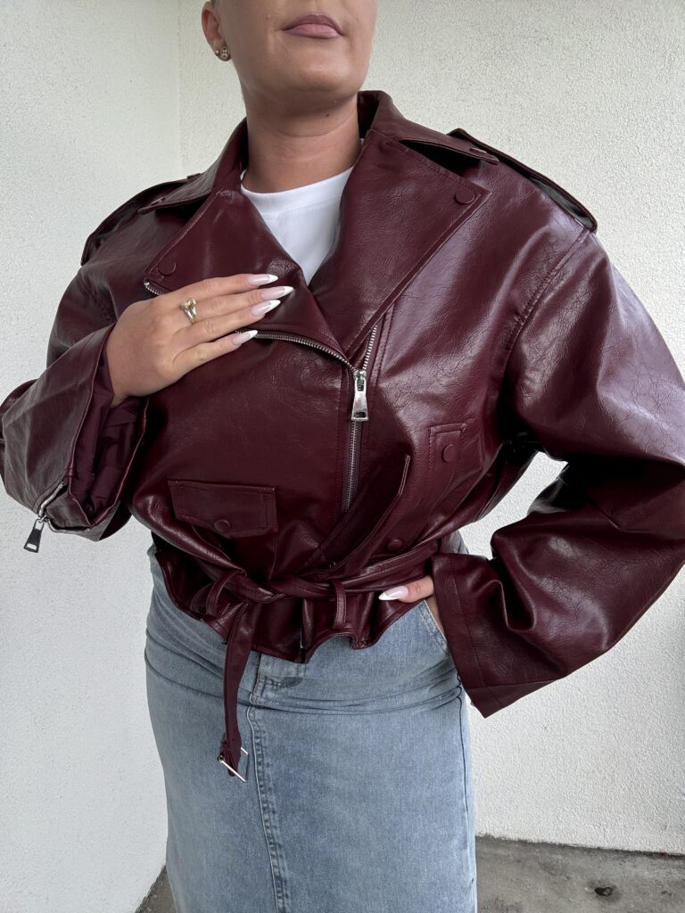 Kurtka Coco – stylowa ramoneska w odcieniu czerwonego wina, ( dostępna również w kolorze czekoladowego brązu) wykonana ze skóry ekologicznej. Luźny krój oversize z paskiem w talii i asymetrycznym zamkiem nadaje jej wyrazistego charakteru, a detale w postaci szerokiego kołnierza i rękawów na suwak dodają nowoczesnego pazura. Idealna, by wyróżnić każdą stylizację.
