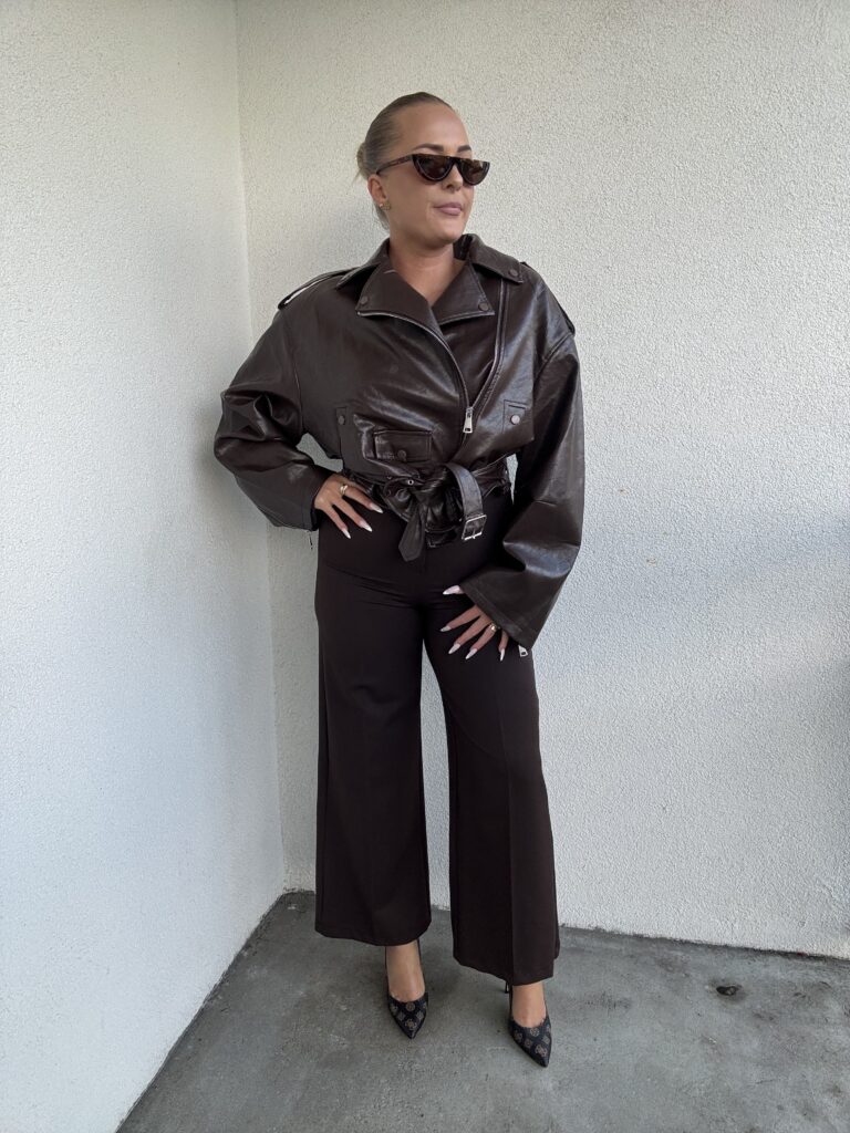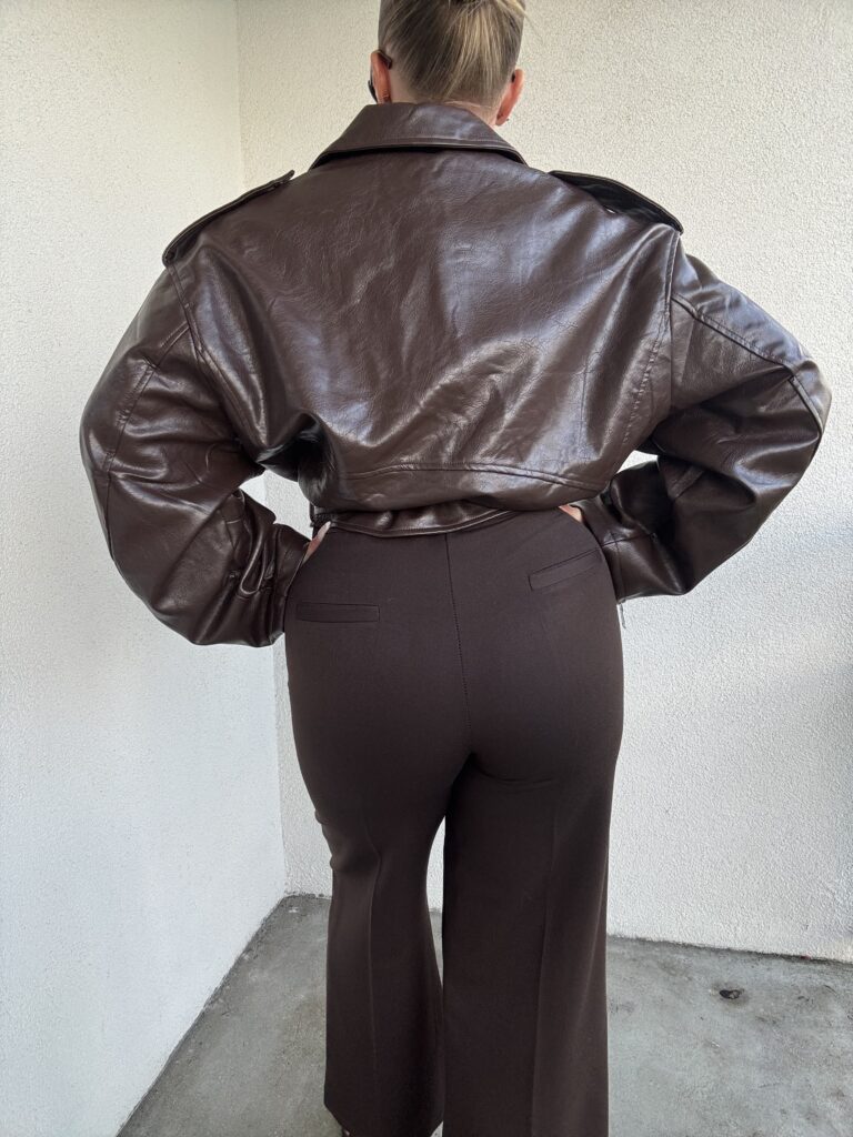 Spodnie eleganckie FRAPPE w kolorze ciemnej czekolady. Szeroka nogawka 7/8 w kant. Spodnie z gumką w pasie. Materiał przyjemny w dotyku, bardzo elastyczny świetnie podkreśla figurę. Idealnie wpasowuje się w jesienne trendy. Rozmiar UNI: od S do małego L.