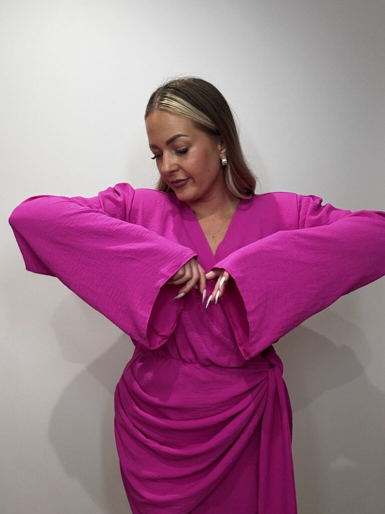 Sukienka kopertowa SHERR to model od polskiego producenta LaMilla. Fason sukienki charakteryzuje się marszczeniem w okolicach bioder oraz dekoltem V i rozkloszowanymi rękawami. Sukienka ma poduszki na ramionach. Rozmiar Uni. Regulowana wiązaniem. S-XL.